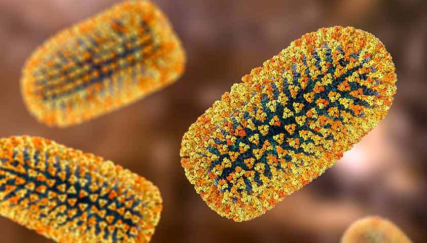 У вируса необычная форма – он напоминает пулю: один конец уплощённый, другой вытянутый. В сердцевине находится генетический материал вируса (РНК), защищённый оболочкой с шипами на поверхности.