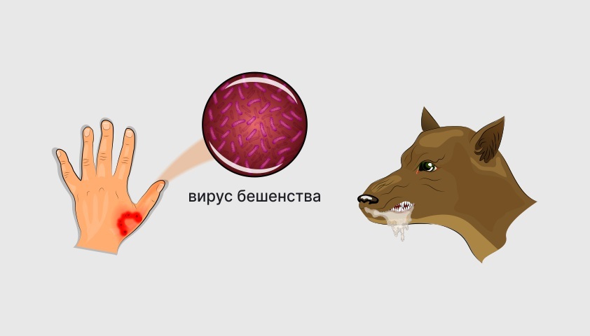 основной путь передачи вируса бешенства человеку — через укус или ослюнение повреждённой кожи и слизистых оболочек