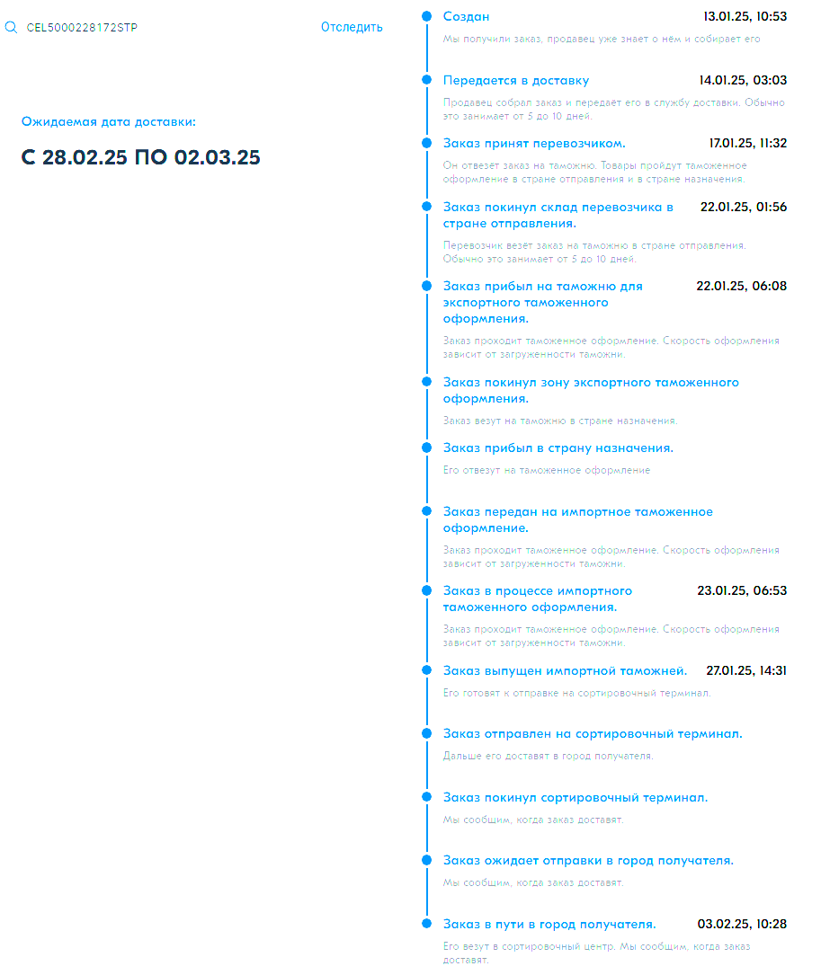 Заказ из китая, давно приехал прошёл таможню, передан в озон, и с тех пор озон просто каждые пару дней сдвигает дату доставки.