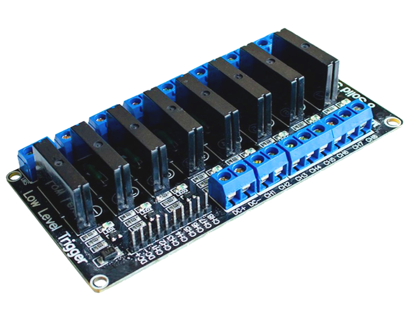 9 лет назад я не нашел подходящих твердотельных реле и мне пришлось их собирать самому из радио-комплектующих. Но на данный момент проще купить 8 канальный модуль твердотельных реле как на изображении, чем заниматься тратой времени на поиск этих компонентов.
