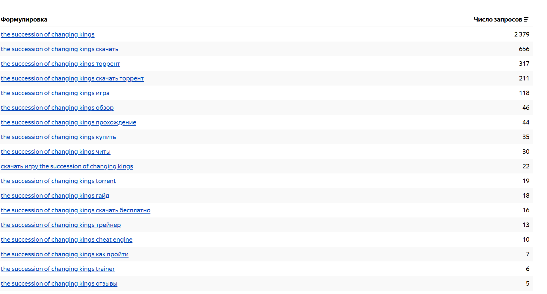 Без рейтинга. 10 февраля я запустил симулятор принятия решений в средневековом королевстве The Succession of Changing Kings. За первые 10 дней игру установили более 2200 раз - это довольно прилично для крошечного инди-проекта в раннем доступе и гораздо больше того, что я ожидал. И решил я тут посмотреть, что ищут в связи с игрой. Это легко делается с помощью официального сервиса Яндекса Wordstat.