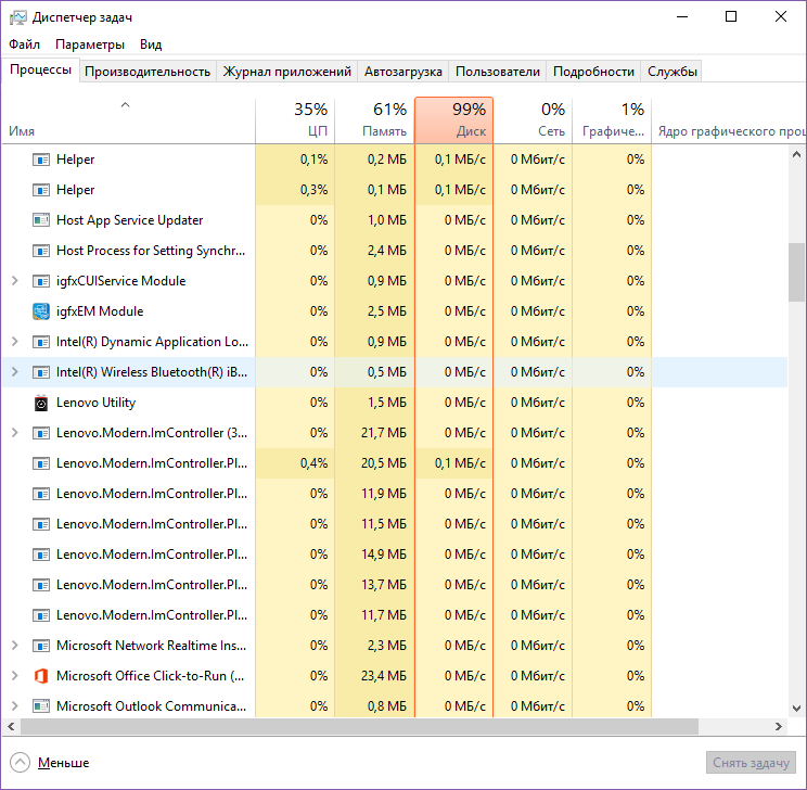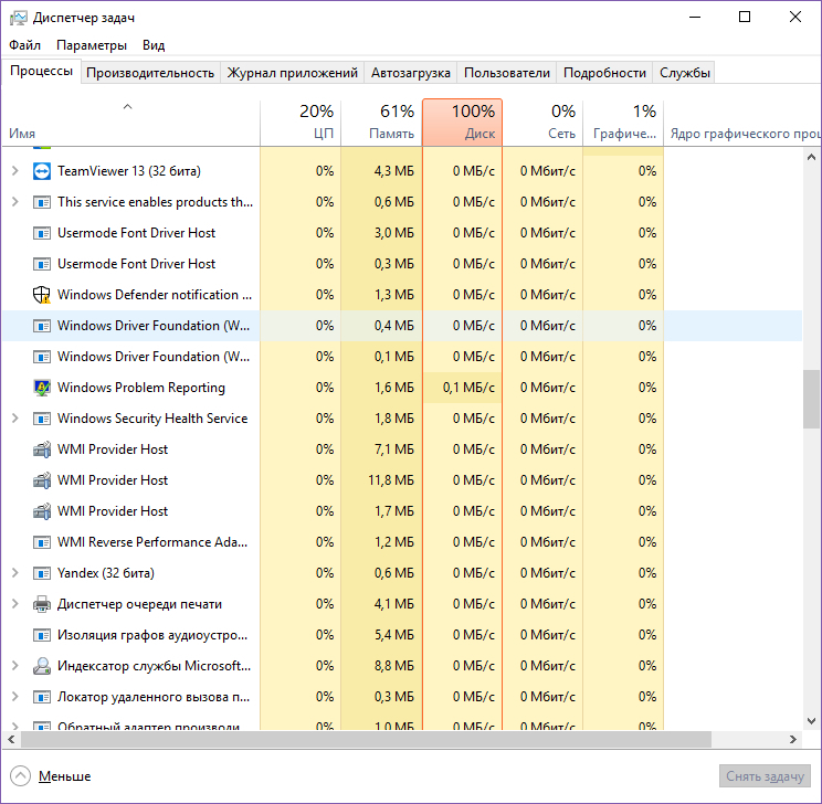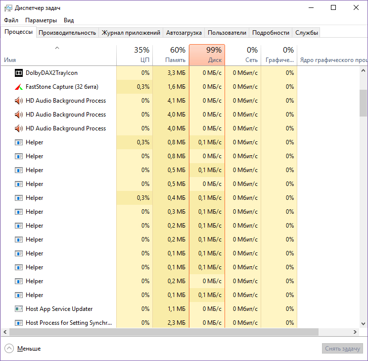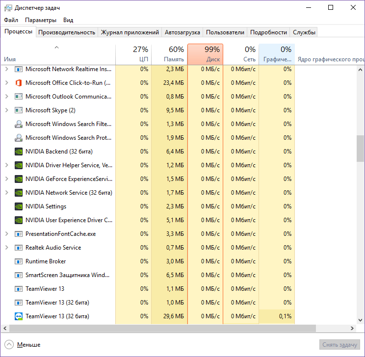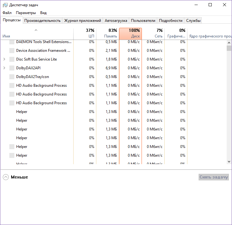 Да, конечно, стоит это всё. Ноут берегу, у него снизу вентиляция, к сожалению, поэтому всегда в наклоне на коленях либо на столе стоит, стол протираю регулярно, чтобы пыль не втягивалась. С покупки примерно месяца четыре прошло, виснуть начал на первом месяце использования. Процессы - ряд русскоязычных системных, еще отдельно стандартные osk и прочие, и мои три-четыре штуки, терминал максимум сколько заедал памяти - 1 гб. Фотошоп примерно столько же, вместе не включаю. Вайбер около 200 мб. Остальные мелочь по сравнению с этими. Нагрузка на hdd да, вот сейчас в реальном времени - 99% цп (я б подумала, что червь какой-то, но комп проверен), память 84%, диск 81%. Работает только опера, вайбер и системные. Опера заедает 600 мб, antimailware 150 мб, вайбер 159 мб.
