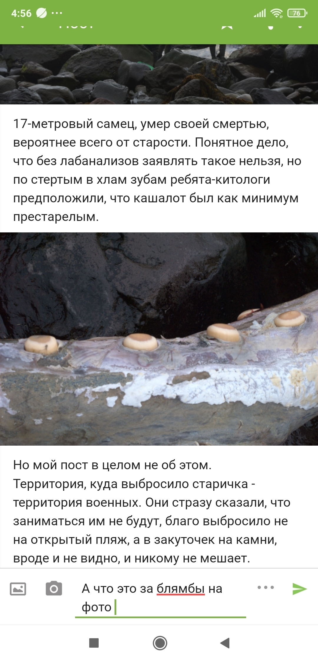 17-метровый самец, умер своей смертью, вероятнее всего от старости. Понятное дело, что без лабанализов заявлять такое нельзя, но по стертым в хлам зубам ребята-китологи предположили, что кашалот был как минимум престарелым.