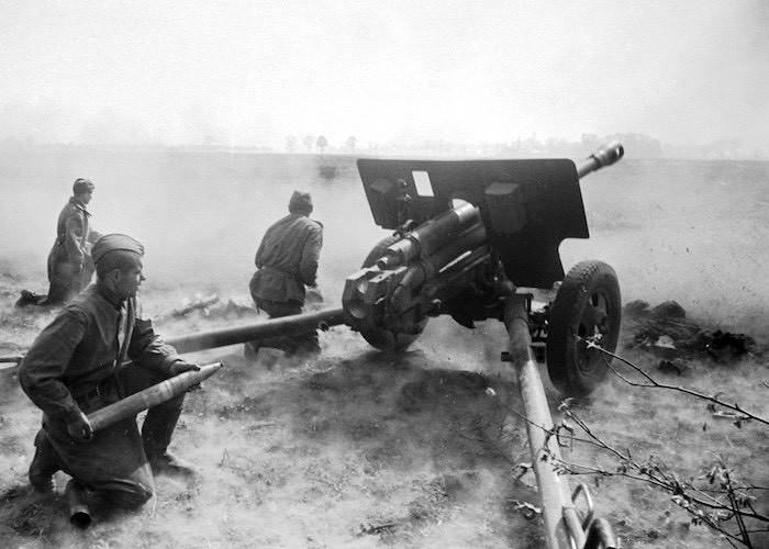 Расчет пушки ЗИС-3 ведет огонь по противнику.