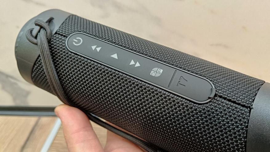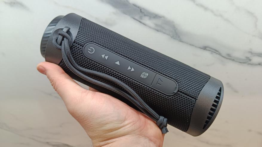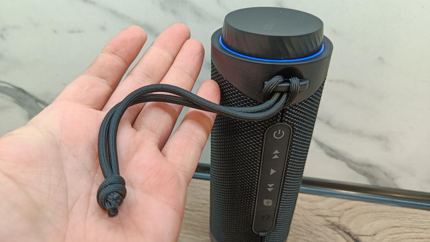 Колонка Tronsmart T7 выполнена в довольно популярном форм-факторе и удобна в эксплуатации. В руке помещается довольно свободно, а в случае необходимости можно использовать «темляк» для подвешивания к выступающим частям. Крепление надежное и выполнено из толстого пластика. За подвес можно не волноваться, выдержит скромный вес музыкальной колонки.