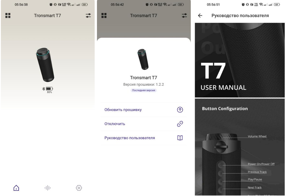 В меню программы можно проверить прошивку и обновление. На данный момент актуальная прошивка версии 1,2,2. Рабочее окно разделено на 3 подстраницы. В первом можно увидеть уровень заряда аккумулятора, посмотреть подробную инструкцию или отключить колонку.