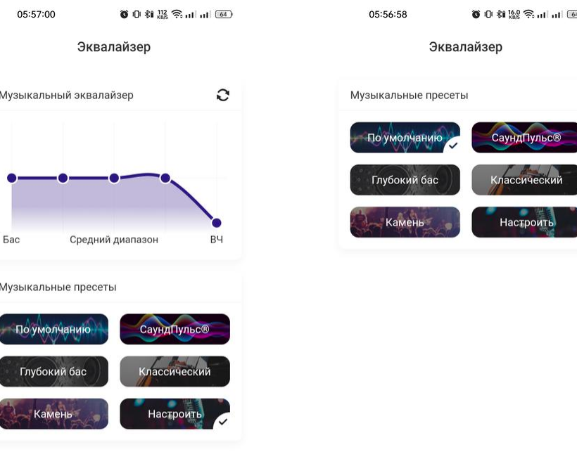 На второй странице производится выбор эквалайзера из представленных или самостоятельная настройка.