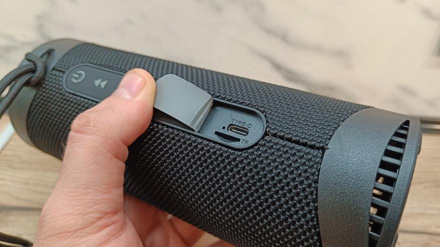 Начнем с управления. Мобильное приложение рассмотрели, там можно выбрать лишь источник и посмотреть уровень заряда, который кстати на самой колонке не отображается. Кнопки на борту позволяют управлять включением и выключением, выбором трека, паузой, а также режимом работы эквалайзера (Sound Pulse). Под заглушкой разместились разъемы USB Type-C и microSD. Заглушка на первый взгляд довольно слабенькая, но со своим предназначением справляется на отлично. После погружения в воду внутри сухо.