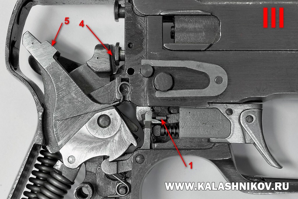 Поскольку предохранитель от случайного выстрела блокирует спусковую тягу, то заряжание пистолета и взведение курков может производиться в любом его положении.