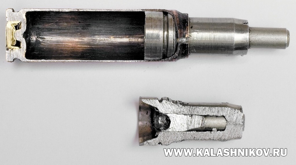 7,62-мм патрон СП-3 только внешне похож на автоматный патрон 7,62х39. При воспламенении порохового заряда, перемещающийся по длине гильзы поршень выталкивает пулю. Фото Михаила Дегтярёва