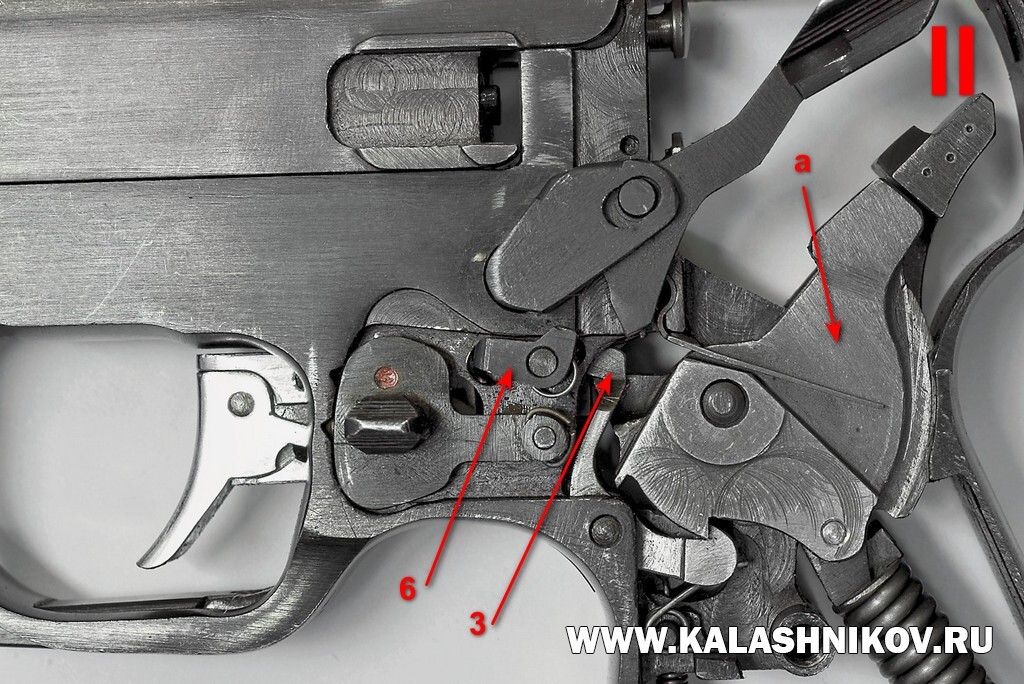 Схема работы УСМ, при первом нажатии на спусковой крючок левый курок ударяет по нижнему ударнику, при втором нажатии правый — по верхнему. При первом нажатии на спусковой крючок (Ил. I) спусковая тяга (1) скользя по горизонтальной поверхности выступа левого курка (2) взаимодействует с верхним плечом шептала (Ил. II поз. 3) при повороте которого боевой взвод шептала выходит из под боевого взвода курка (4).