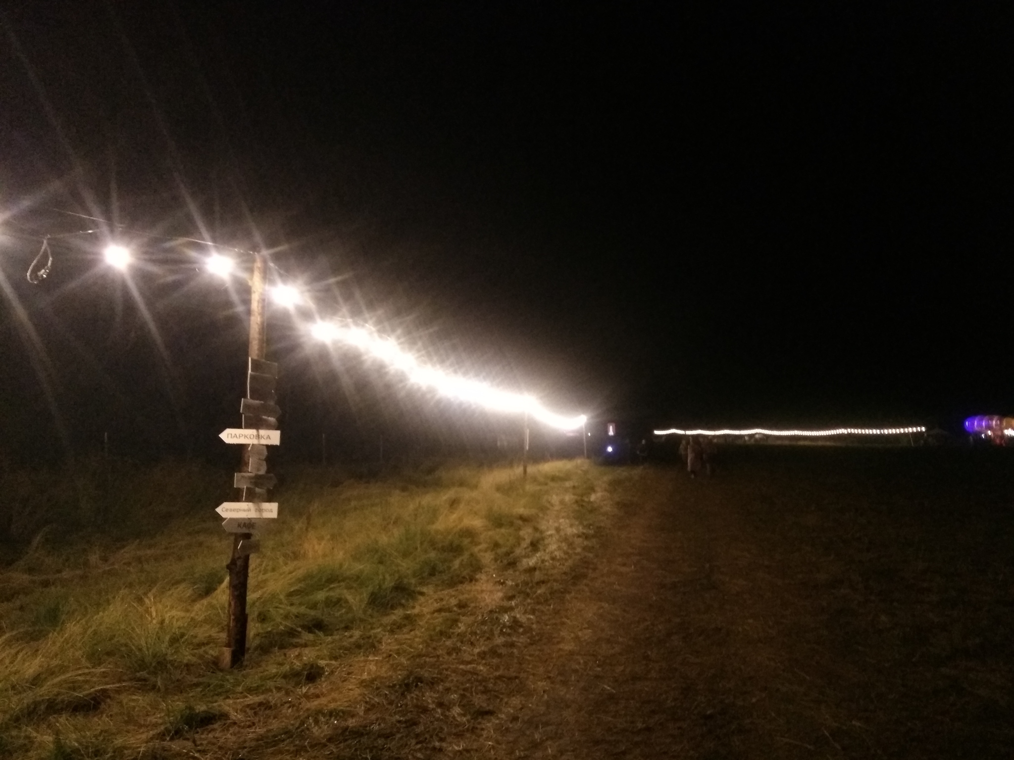 Мы достали вещи из машины, донесли их до лагеря. Возвратились еще за вещами, отнесли их. Поставили, наконец, палатку со столиком и стульями. Пошли еще раз и на парковке наступает вечер. На поле нас приветствует кафе "Улей".