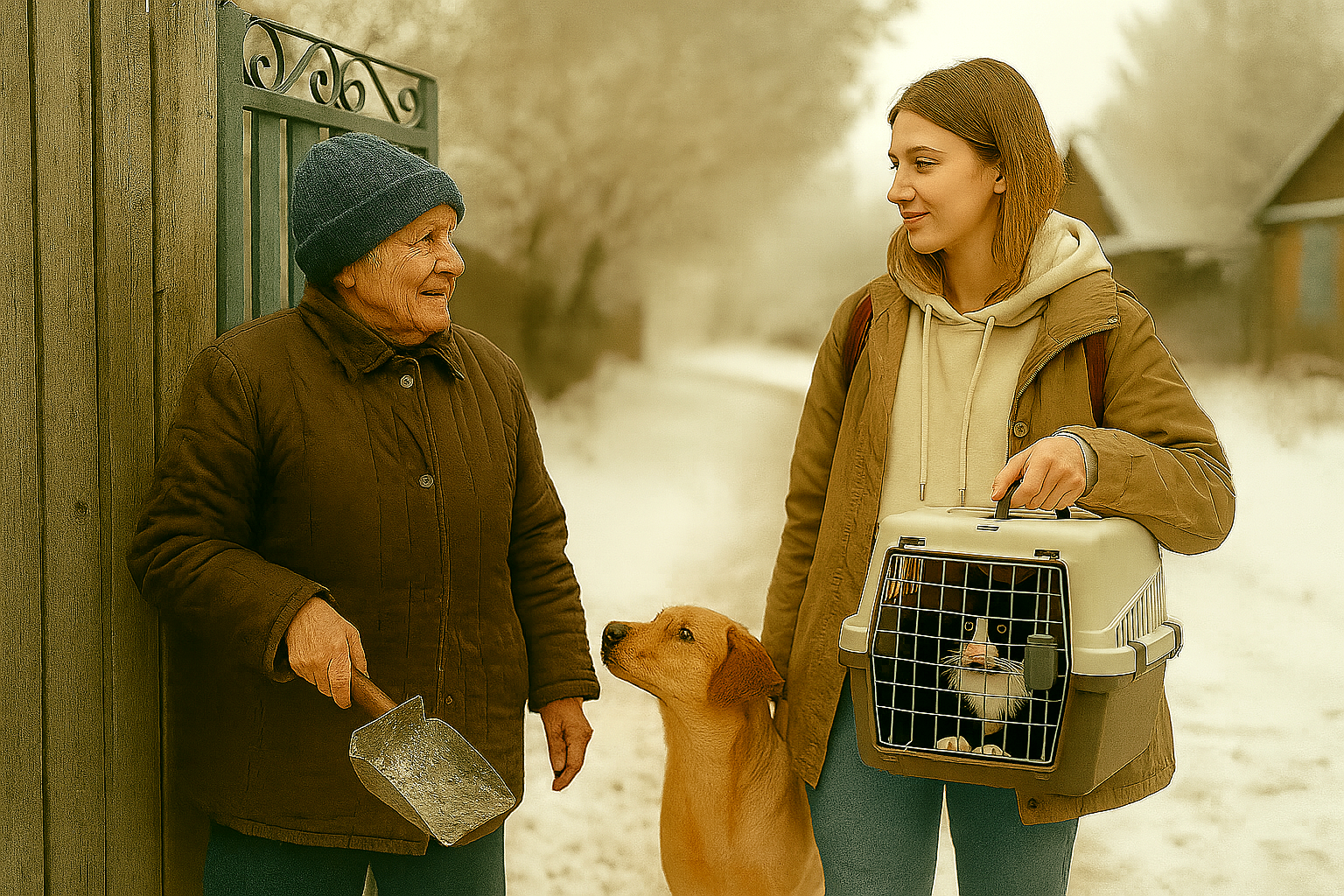 Поездка заняла три с половиной часа: две электрички, автобус с запахом керосина и пятнадцать минут пешком по хрустящей наледи. Мостик скулил у дверей автобуса, будто чувствовал, куда едет. Пиксель сидел в переноске и смотрел в упор, как будто тоже имел мнение по этому поводу.