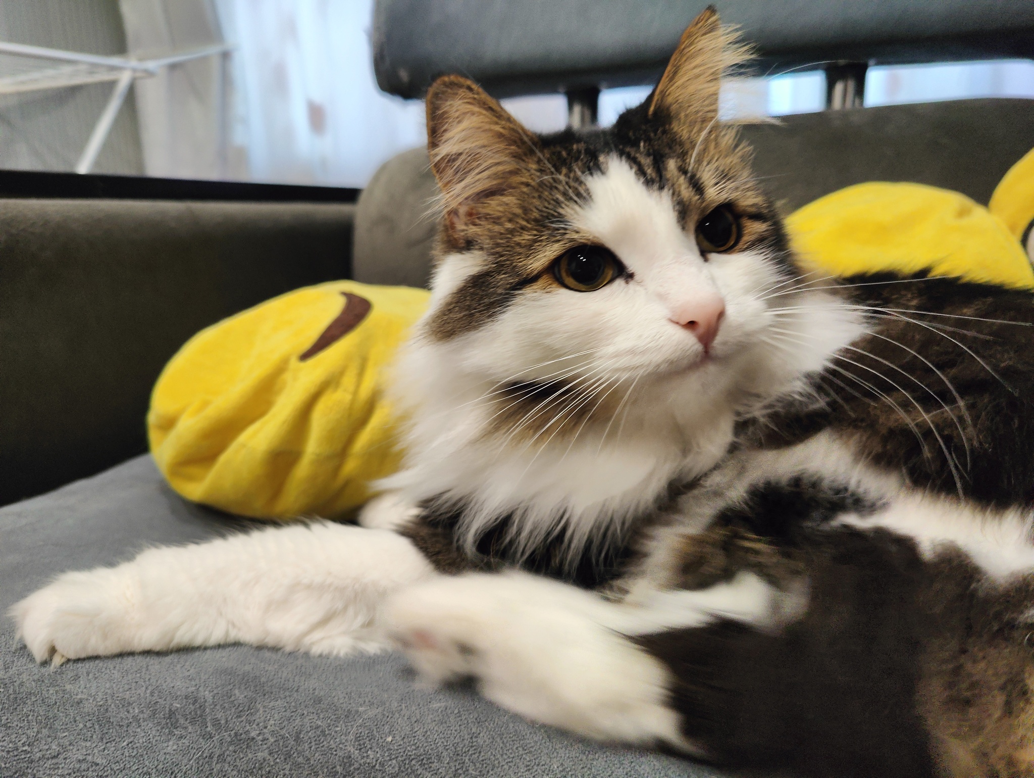 Подобрала с улицы трехцветную красавицу, очень ласковую и ручную, поставила прививки, помыла, приучила к лотку.