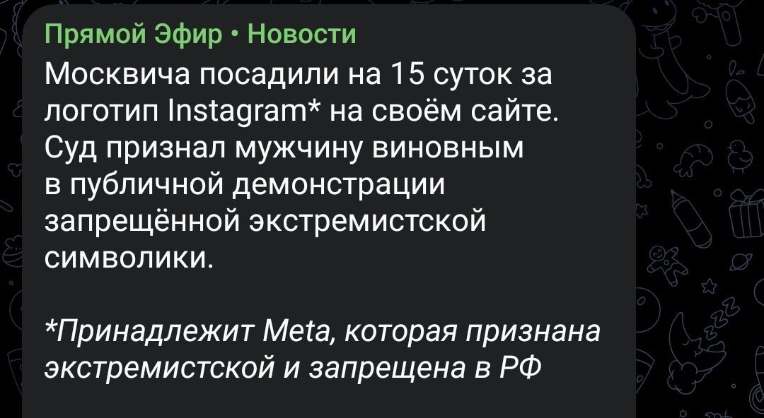 1867 arston Политика Без названия 14 дней назад Да Но.. https://t.me/novosti_efir/82760https://www.mid.ru/ https://www.mos-gorsud.ru/rs/meshchanskij/services/cases/admin/details/f150ee90-0e33-11f1-b185-39fe0e7d33e7?participant=солдатов Тэкс, ну и конечно же: *Компания Meta признана в РФ экстремистской организацией и запрещена https://www.rbc.ru/rbcfreenews/699d3cea9a7947d2288fec45 МИД Изумление Telegram (ссылка) Политика 307 208 66 16 14 3 1 1 1 1 1 1 Ещё 7