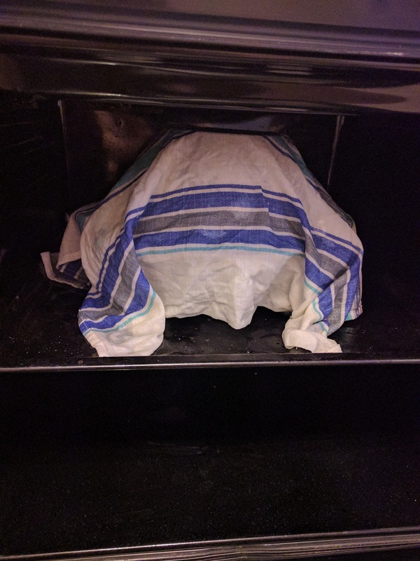 Далее расстойка. Я расстаиваю ночью, т.к. работа забирает остальное время. Предварительно прогреваю духовку до 50 градусов и выключаю. Накрываю импровизированным колпаком из перевернутого дуршлага, накрытого мокрым полотенцем. Если накрыть просто полотенцем - оно может провиснуть, к нему приклеится тесто и при приготовлении не получится аппетитной корочки сверху. Формы в духовку - и спать.