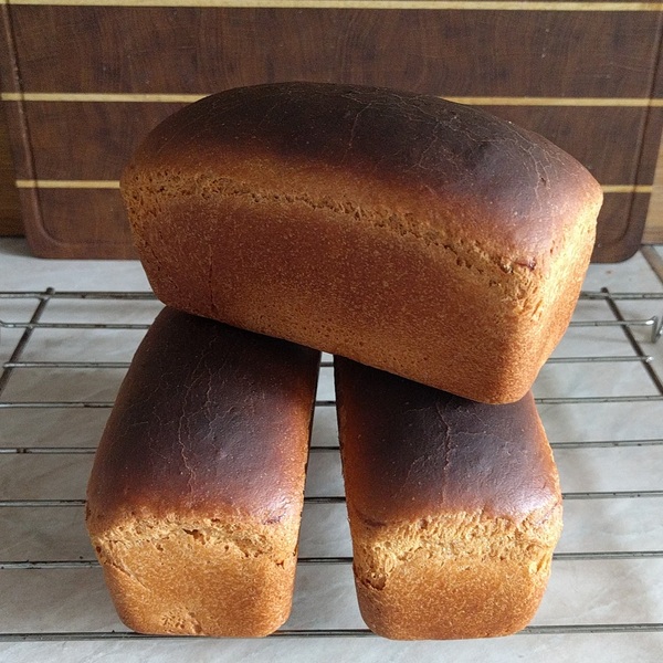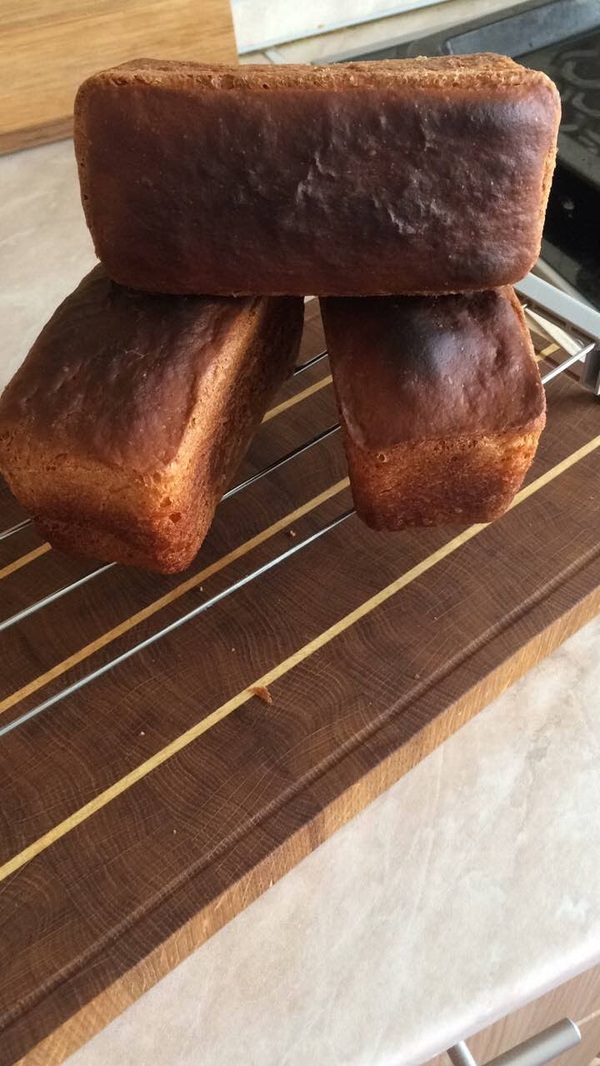 На 220 гр держим 20 минут, потом уменьшаем температуру до 180 и еще 35 минут. В сумме выпечка 55 минут, но чем дольше держать на 220, тем чернее корочка. На выходе получаем вполне приличные на вид буханки.