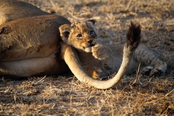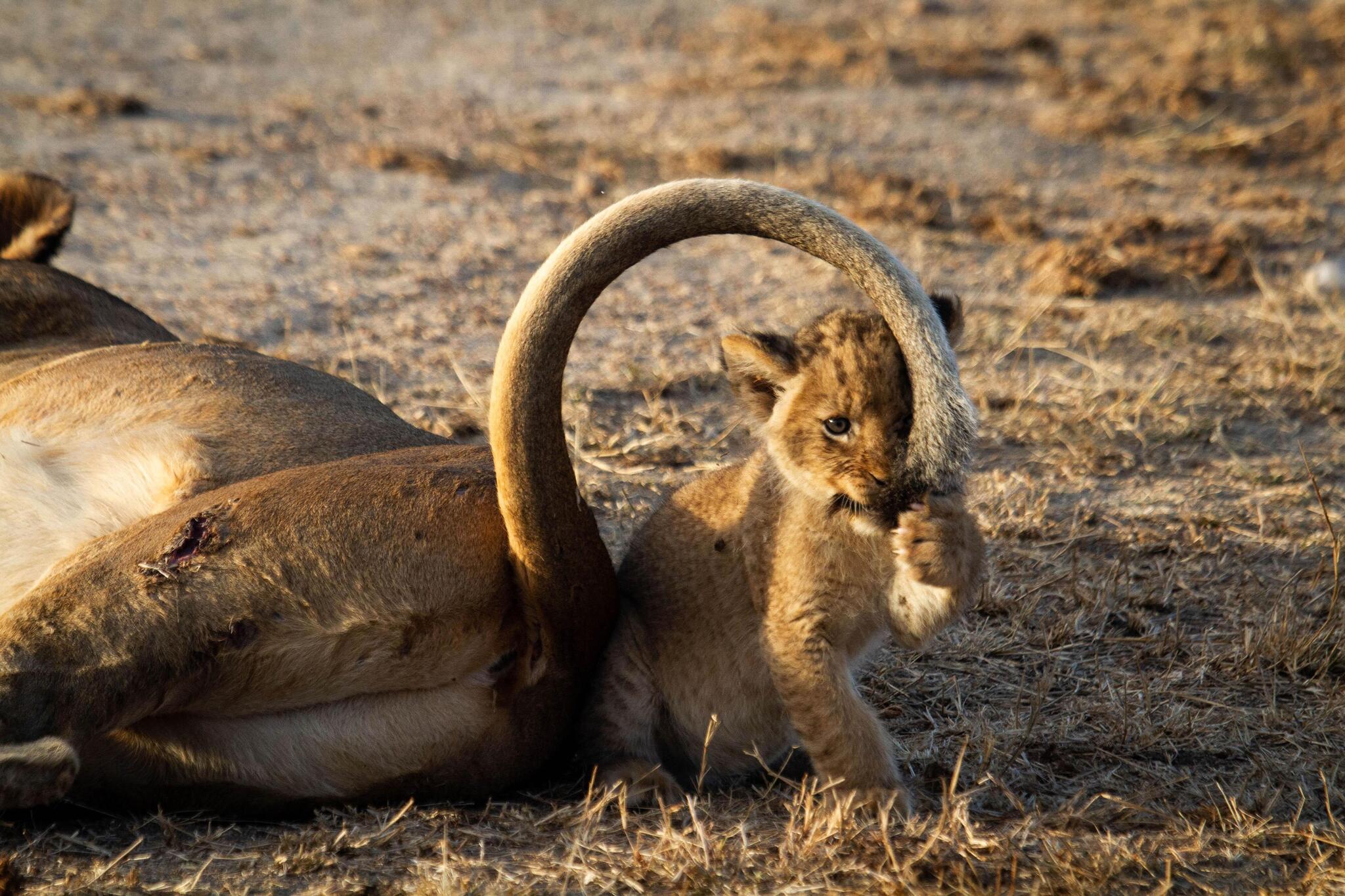 Фотограф Роан дю Плесси во время поездки по частному заповеднику Нгала смог запечатлеть львят, играющих с хвостом матери, которая терпеливо переносила их активность. Периодически хвост львицы изгибался в форме вопросительного знака, и малыши задумчиво поглядывали на него, словно пытаясь отыскать некий ответ.
