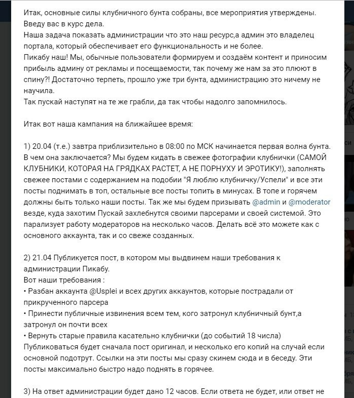 Вместо этого модерация удаляет клубничку без банов, соответственно это расхолаживает пользователей, соответственно усложняет им самим же работу, в итоге это стало игрой с которой модерация уже тупо не справляется, т. к. ресурсов не хватает. В итоге имеем срыв и очередной бунт. Плюс очень медленную реакцию на происходящее. Практически двое суток прошло с момента начала бунта, и только теперь администрация признаёт что ошиблась, да и то скорее под впечатлением от происходящего, т. к. ещё сутки позиция была "мы всё правильно делаем".