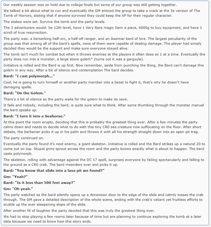 К этому моменту комната разразилась обсуждением того, что возможно это величайшая в мире вещь (в контексте их игрового опыта). Через несколько минут они успокоились и им потребовалось решить, что же делать с этим крохотным морским существом с CR0, в данный момент задыхающимся на полу. После непродолжительных дебатов, варвар поднял морского конька и со всей силы кинул его прямо в открытую яму ловушку.