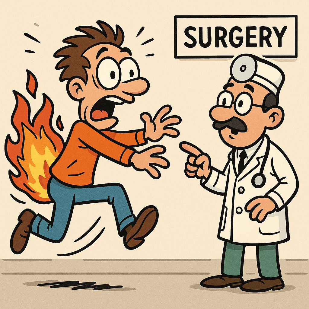 Врач, он хочет хорошо жить. В свое удовольствие. На свободе. И он отвечает за вас. Поэтому если проктолог говорит, что данный тип операции лучше делать в стационаре, лучше не просите его лечить на всю котлету без оглядки, а обсудите стационарные варианты. Либо что делать в амбулатории, если что-то пойдет не так. Лично я предлагаю амбулаторные операции только в том случае, когда знаю, чем помочь пациенту, даже если начнется кровотечение, отек Квинке, пожар, анестезиолог упадет в обморок, а на крышу здания упадет дроп-под с космодесантником.