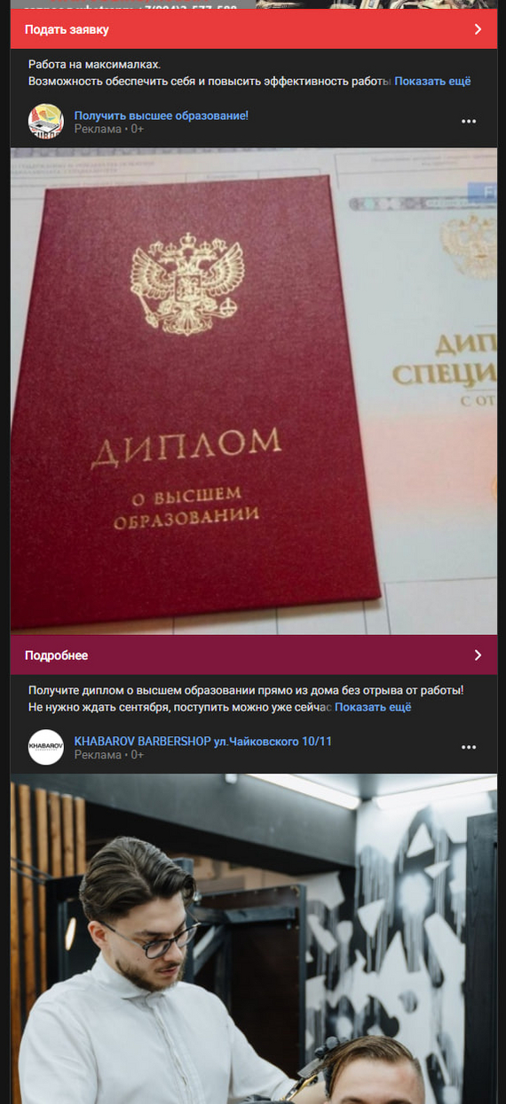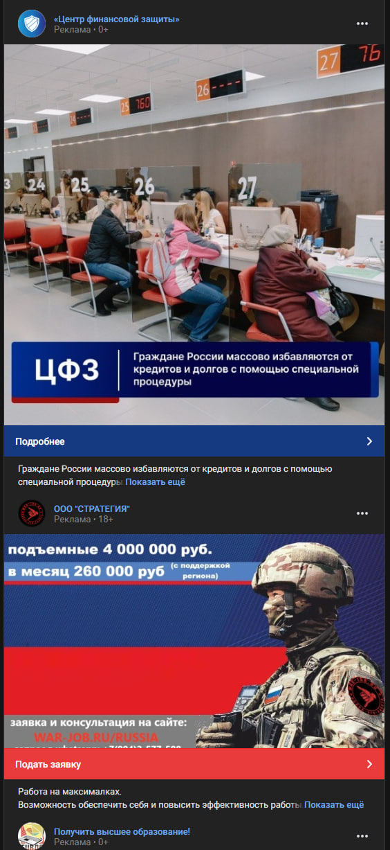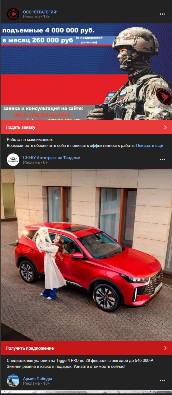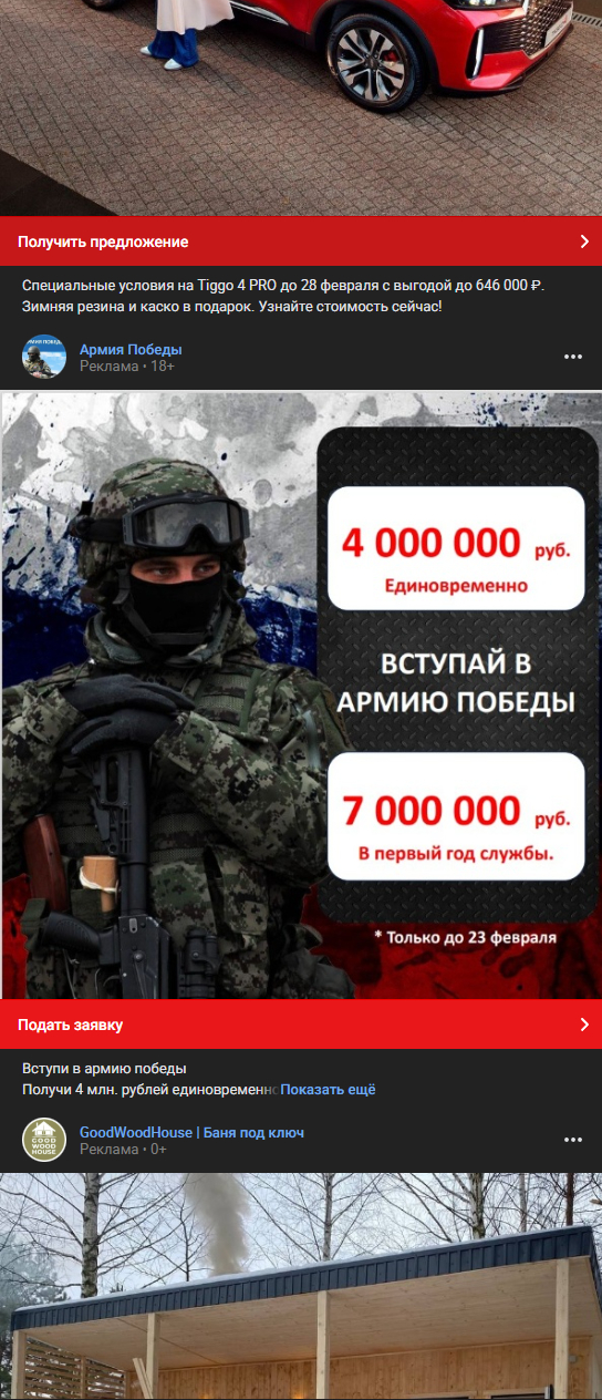 3 Valaybalalay 8 месяцев назад Безумно интересная лента ВК Вот так выглядит моя лента ВК сейчас. 10 рекламных постов подряд, большая часть из которых - служба по контракту. Я за последнюю неделю на каждой подобной рекламе жму "Не интересно". Но разве ВК интересует, что мне там интересно? [моё] ВКонтакте Реклама Социальные сети Скриншот Длиннопост Ещё 0