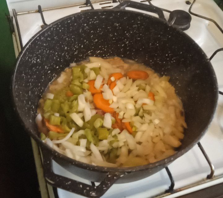 Как закипело - кидаем в неё мясо, морковь, лук и болгарский перец. Можно сразу же добавить приправу.