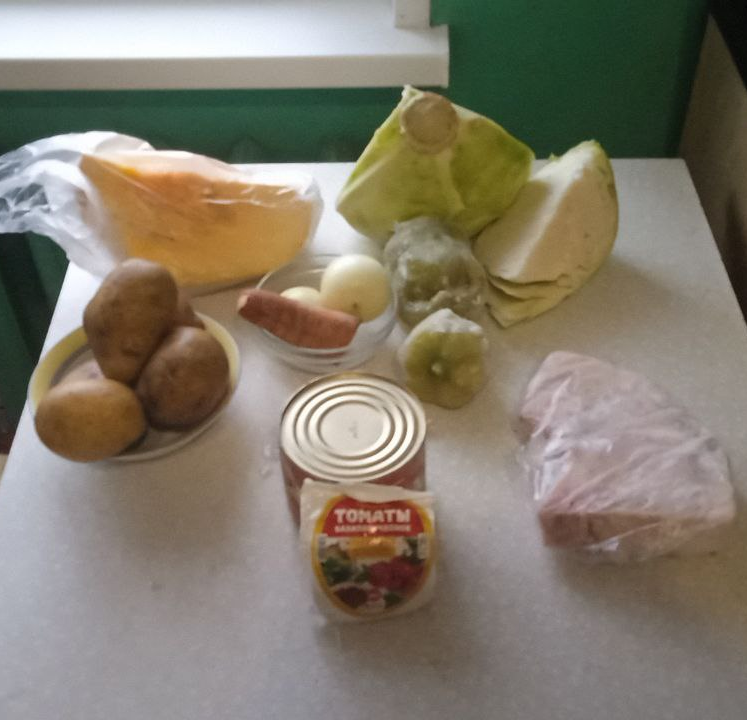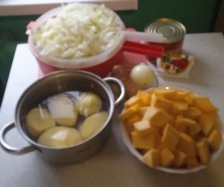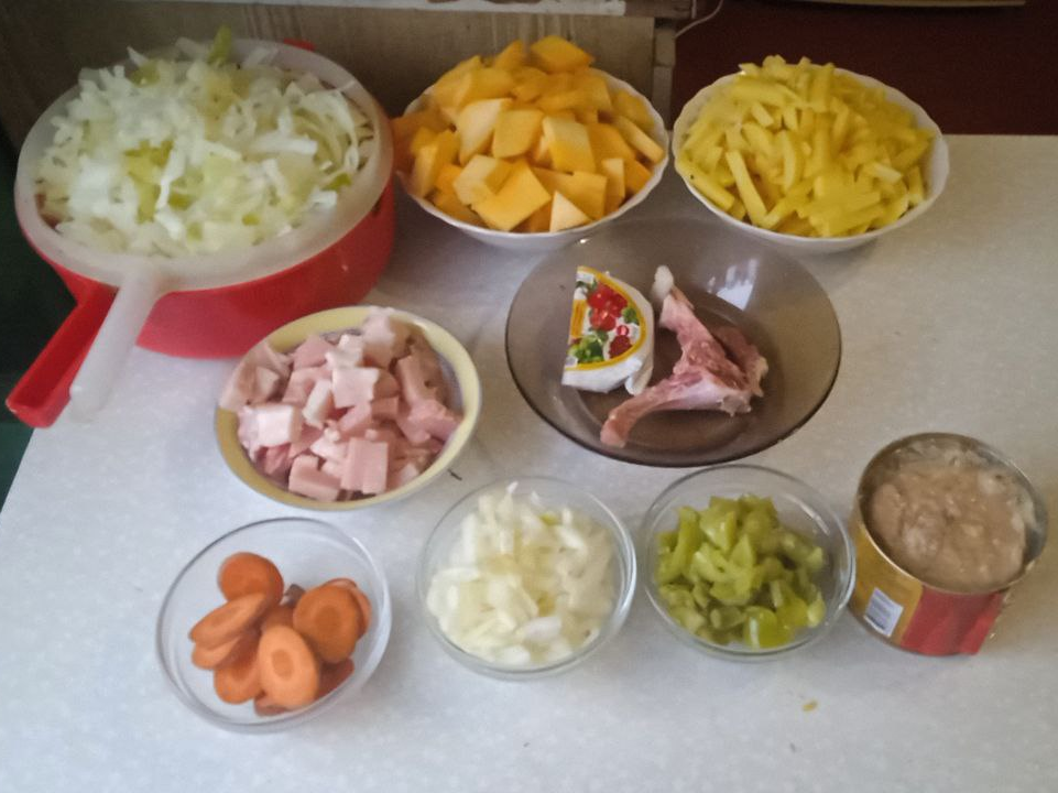 Картофель, капуста, тыква, лук-морковь-перец, приправа тушёнка, свиная котлета на кости (эскалопа не было)