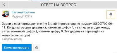 Не мог дозвониться час до оператора с билайновской симки по номеру 0611. Позвонил с МТС на горячую линию Билайн по номеру 8-800-..... и пяти минут не прошло как ответил оператор.