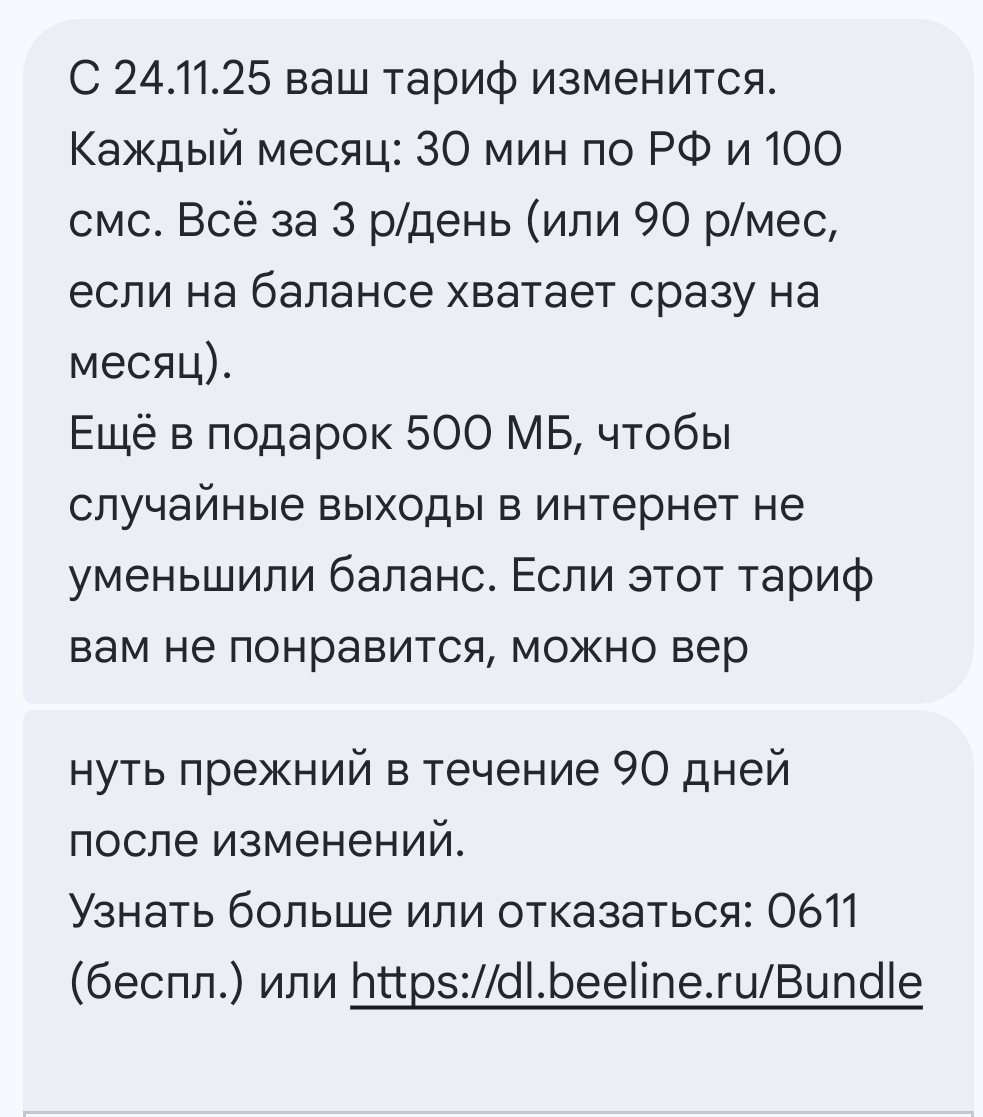 Есть у меня обычный кнопочный телефон, пользуюсь если основной сядет. Тариф без абонентской платы. И тут приходит смс. Я их обычно не читаю, повезло что не пропустил.