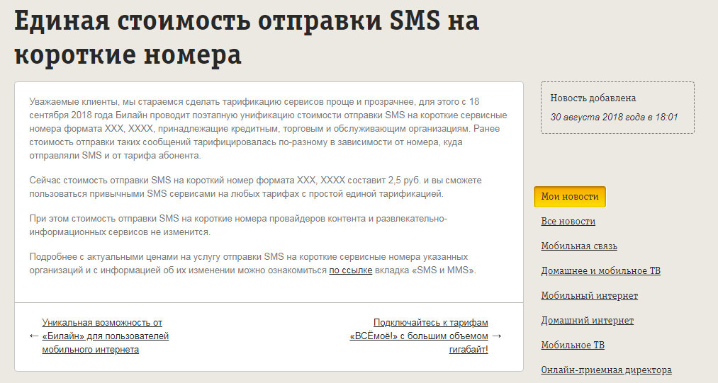 Сижу на пакетном тарифе и в ус не дую, 1200 бесплатных СМС. Сегодня не могу отправить СМС на короткий номер 900 (сбербанк). Начал разбираться, позвонил в Билайн. Нежданчик прилетел откуда не ждали. Теперь отправка СМС на все короткие номера стала за доплату 2,5руб/СМС.