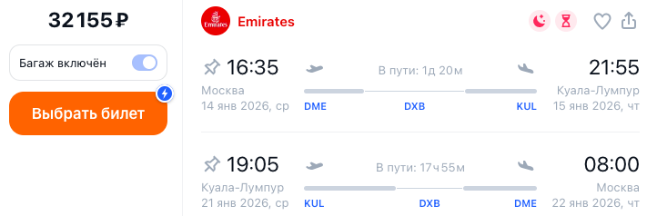 Сегодня начал смотреть фильм от Нетфликса «Skywalkers: История одной пары» и решил заодно посмотреть, что там с билетами в Малайзию. Повезло: обнаружил аж две даты, когда можно улететь из Москвы в Малайзию всего за 32000 рублей. Это с багажом и на борту одной из лучших авиакомпаний мира (мнение не мое, а всяких там опытных экспертов).