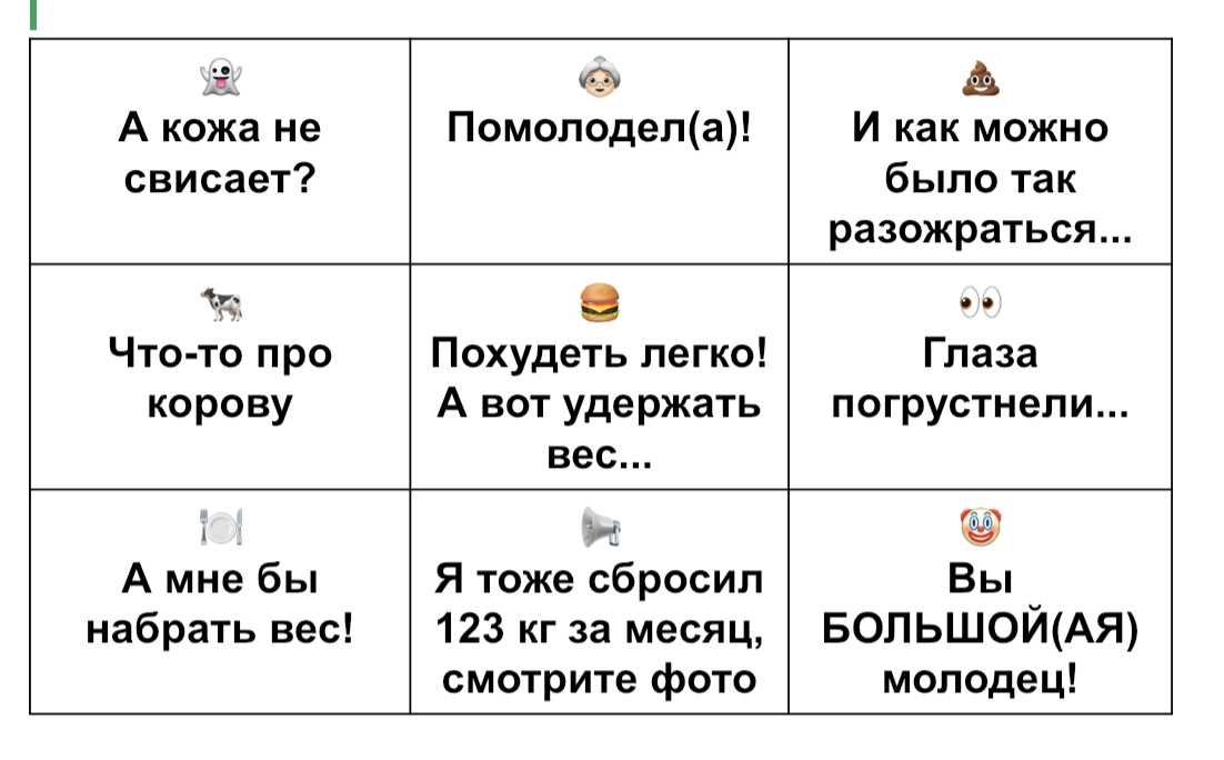 Я люблю посты о похудении. Всегда радуюсь за их авторов, но вот от некотоых комментариев рука невольно тянется к лицу... Я решила сделать бинго из таких комментариев. Господа, будьте оригинальнее (а еще тактичнее и добрее).