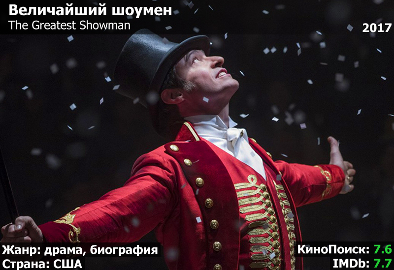 Может ли семейный биографический фильм быть хорошим? Почему бы и нет, если в нем присутствуют умелые актеры, съемки вел великолепный оператор, а бюджет составлял 84 миллиона долларов. В этой киноленте о человеке, который, по заявлению ее авторов, по сути придумал шоу-бизнес, главную роль исполнил наш любимый Хью Джекман. Помогали ему Мишель Уильямс, Зак Эфрон и Ребекка Фергюсон. Операторской работой занимался Шеймас МакГарви, через объектив которого мы когда-то смотрели первых «Мстителей» (тогда еще никто не подозревал, что их будет миллион). В общем, это красивое, яркое и музыкальное кино от режиссера-дебютанта (как такому дали 84 ляма?) Майкла Грэйси!