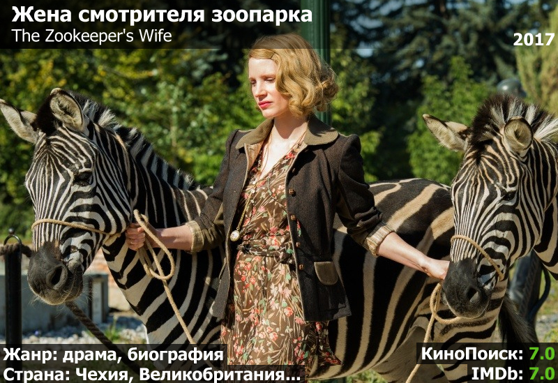 Этот фильм снят по мотивам книги Дайан Акерман, основанной на дневниках Антонины Жабинской. Если вы вдруг не знаете, кем является последняя из перечисленных барышень, то можете как раз посмотреть данное кино, чтобы быть в курсе. Если же вы знаете, кто это, то скорее всего вам будет еще интереснее смотреть сие кинопроизведение. Главная роль у обворожительной Джессики Честейн (снова она). Злодея играет Даниэль Брюль. Снимала фильм Ники Каро. На выходе мы получили неплохое кино с правильной идеей, но излишней пафосной сиропностью и невнятным главным злодеем.