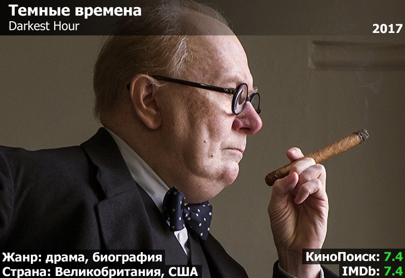 Этот британско-американский фильм стоит посмотреть хотя бы ради великолепной игры Гари Олдмана, за которую он получил «Оскар» (давно было пора) и «Золотой глобус». Всего у картины было 6 номинаций на главную кинонаграду, в том числе в самой главной категории — «Лучший фильм». Из них, помимо лучшей мужской роли, киноакадемия также отметила награждением грим и прически. Кино получилось очень визуально красивым, в таких тусклых тонах и с изящной операторской работой. Кому-то оно, конечно, покажется скучным, так как состоит в основном из диалогов, но истинные киногурманы скорее всего должны получить от нее удовольствие.