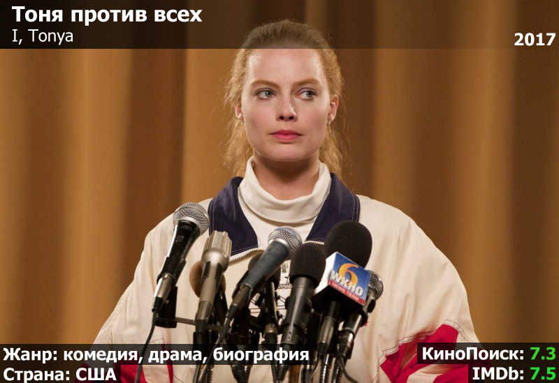 Кинобиографии скандальных личностей — это почти всегда круто. Сразу предупрежу вас: фильм снят иронично, несерьезно и с постоянными сценами ломки 4-й стены. По сути это лишь условная биография известной фигуристки Тони Хардинг в исполнении красотки Марго Робби… что-то типа киноленты, снятой по мотивам эпизодов из жизни известной личности. Однако при этом картина даже получила две серьезные награды — Эллисон Дженни завоевала «Оскар» и «Золотой глобус» в номинации «Лучшая женская роль второго плана» за воплощение на экране образа мамы главной героини. Персонаж, и правда, получился крутой. А снимал эту любопытную кинокартину Крэйг Гиллеспи.