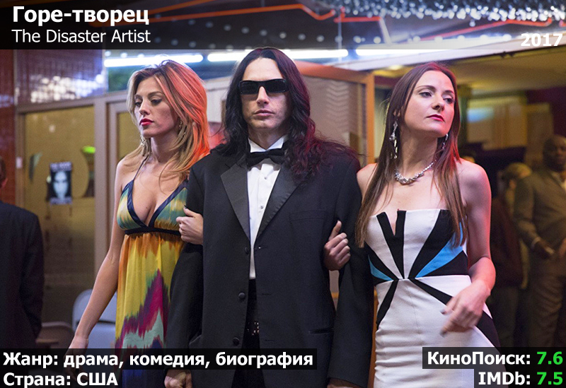 В 2003 году был снят, по мнению многих, самый ужасный фильм в истории кино. Он назывался «Комната». Лента была настолько нелепа, что обрела культовый статус. И вот спустя 14 лет знаменитый американский актер Джеймс Франко, еще не успевший тогда получить обвинения в непристойном поведении, захлестнувшие Голливуд, решает стать режиссером и главным актером фильма, в котором рассказывается, как же была эта самая «Комната» снята. На роль друга главного героя Джеймс взял своего брата Дэйва... ну и начал снимать… В отличие от фильма 2003 года, «Горе-творец» получился отличным. А сам актер получил за свою роль «Золотой глобус».