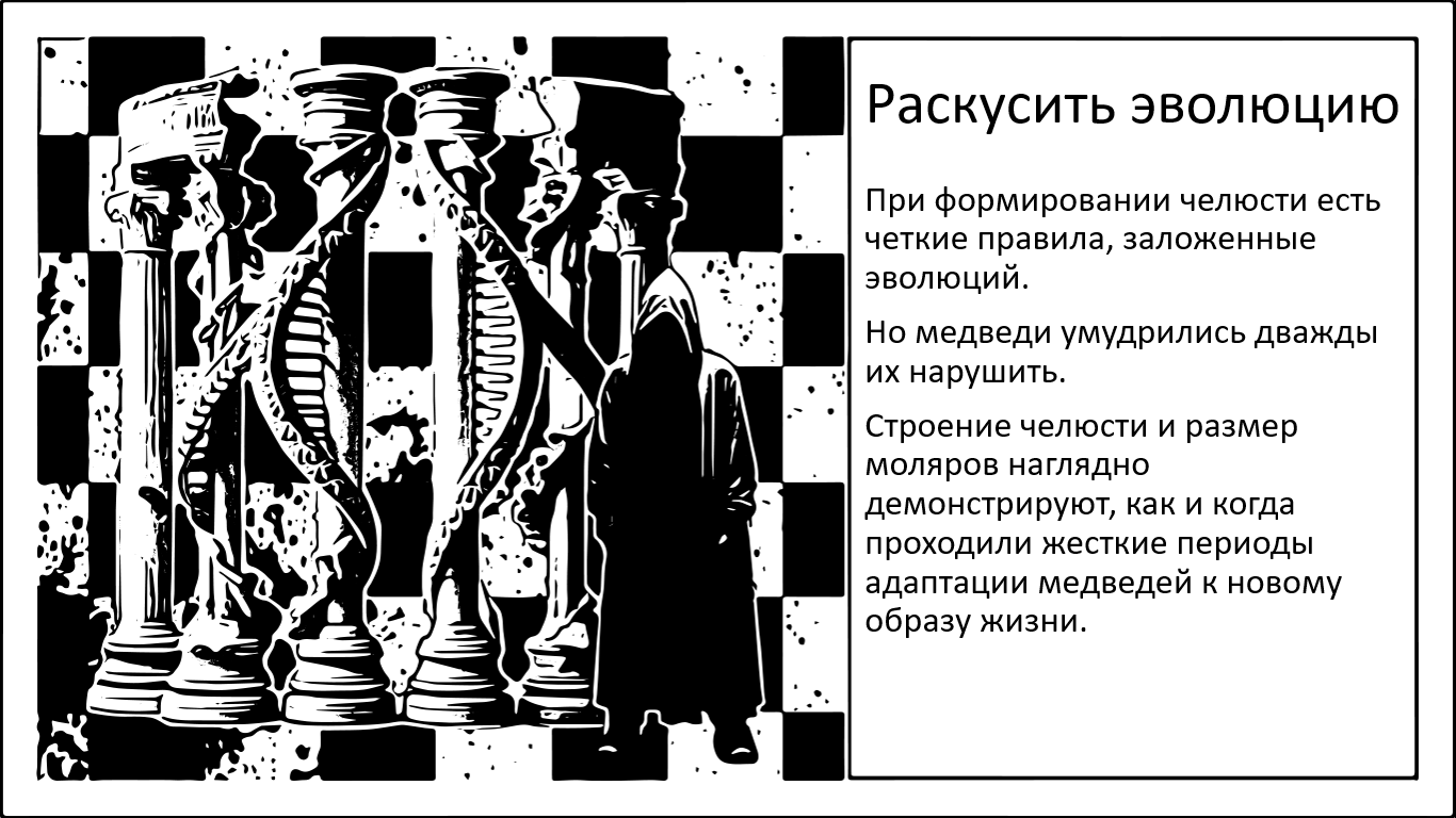 Если читать статью, то формируется вполне логическая цепочка причинно-следственных связей. Мол, это же нормальная эволюционная реакция на меняющийся мир, а внутриклеточная матрица зубов (ВКМ) — это строго контролируемое правило развития, которое управляет ростом моляров у большей части млекопитающих. Однако медведи нашли способы обойти эти ограничения дважды, взломав саму программу, что до сих пор заметно по строению пасти их потомков.
