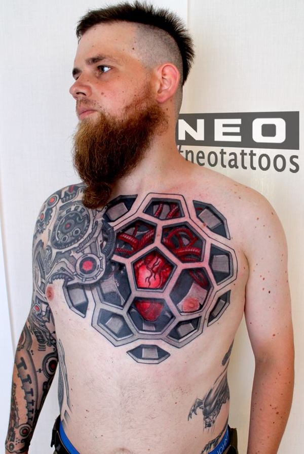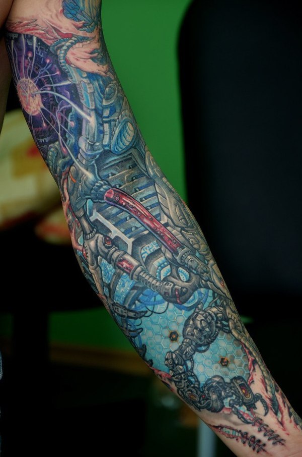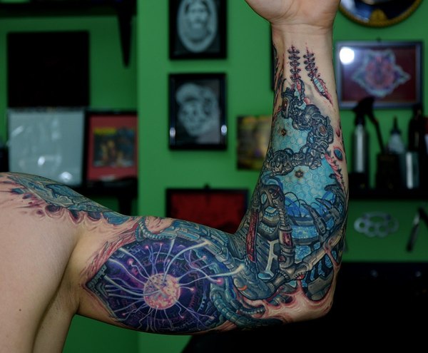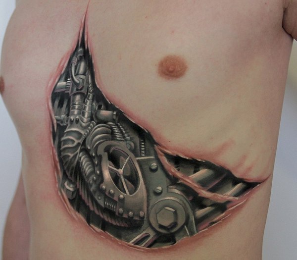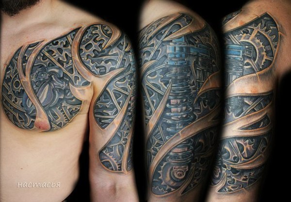 Стиль тату Биомеханика представляет органичное переплетение изображений механических деталей с кожным покровом. Типичный биомеханический дизайн – разорванная деталь, словно выступающая из тела, изображения микроплат, чипов, проводов и т.п. элементов, создающих иллюзию продолжения частей тела.