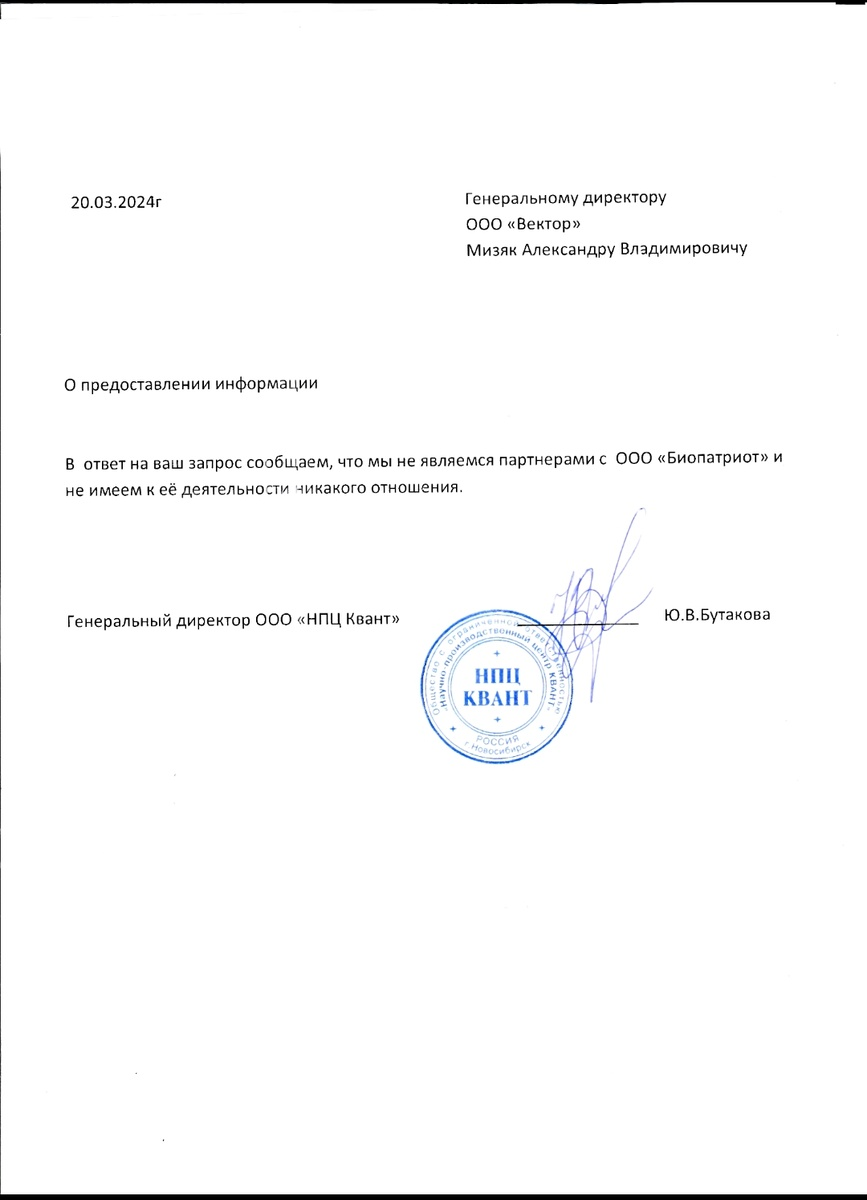 :-Директор ООО "НПЦ Квант", который выпускает платформы «Миофлекс» (куда уж выше уровень?) ничего о партнерстве с Биопатриотом не знает. Есть официальный ответ: