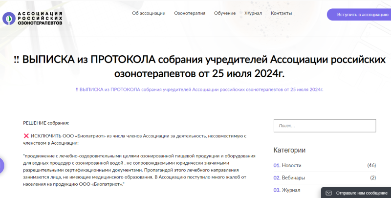 Информация на сайте АРО опубликована в НОВОСТЯХ за июль месяц.СвернутьАРО существует с 1995 года. ЗА 30 ЛЕТ ЭТО ЕДИНСТВЕННЫЙ СЛУЧАЙ ИСКЛЮЧЕНИЯ ЧЛЕНА ИЗ АССОЦИАЦИИ! АРО пришлось даже Устав из-за Биопатриота изменить, т.к. процедура исключения не была предусмотрена Уставом!Но «транслятор идей Будды и Иисуса», как себя называет Биопатриот, продолжает использовать сертификат члена АРО, хотя ему запретили это делать, уведомив письменно. «Воины света», я считаю, так не поступают!Все документы по маслам и установкам, которые Биопатриот предъявляет публике, СФАЛЬСИФИЦИРОВАНЫ, о чём свидетельствуют ответы из «Ростехнадзора» и «Роспотребнадзора».