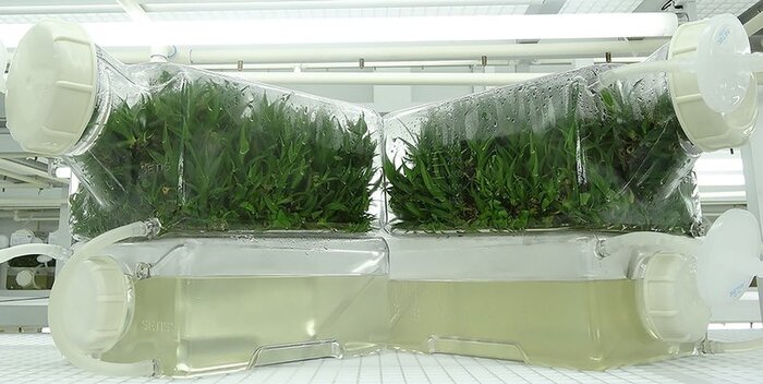Эта технология называется биореактором временного погружений (temporary immersion bioreactor). Растения поливают питательной средой пару раз в день за счёт поворота биореактора.