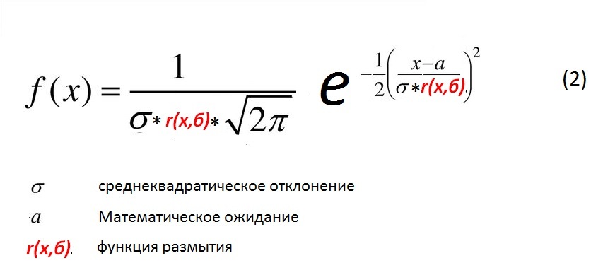 Поскольку б (среднеквадратическое отклонение) для БР переменная, то логично было бы представить ее в виде функции, либо добавить к текущему значению б «функцию размытия» r(x,б). Тогда для биржевого распределения будем иметь формулу следующего вида: