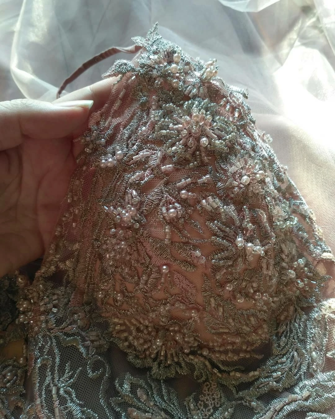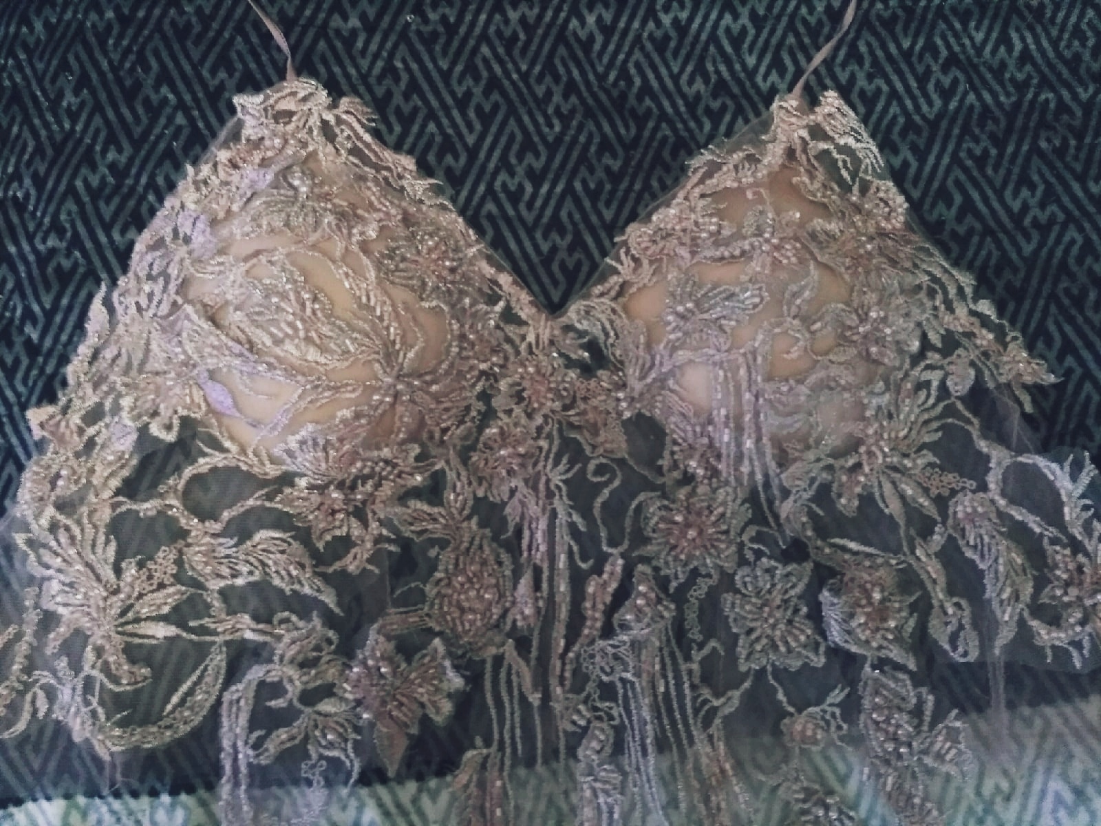 Чашечки слишком торчали из-под расшивки, поэтому решено было перекрыть их максимально. Много-много мелких кусочков кружева и отдельных бисерин и вот результат