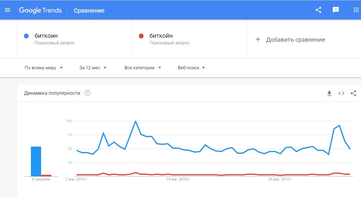 Это также наглядно подтверждается сервисом Google Trends — сравнение частоты поисковых запросов слов «биткоин» и «биткойн»: