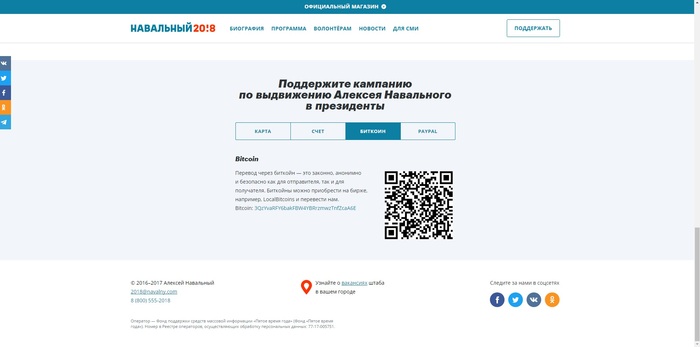 В истории транзакций видим, что довольна часто приходят крупных переводы, свыше 1 BTC. https://www.blocktrail.com/BTC/address/3QzYvaRFY6bakFBW4YBRr... Можно прикинуть, что примерно каждый десятый перевод свыше 1 BTC (на странице из 19 переводов, 1-3 перевода больше 1 BTC). Многие крупные переводы сделаны с одноразовых кошельков (создали кошелек, получили N биткоинов и отправили их же на кошелек Алексею, и больше туда никогда не заходили). Мне интересно, кто эти люди, которые могут отправить пожертвования Алексею суммами свыше 4500$? Конечно, есть много микро переводов по 1$-5$ от простых людей, которые искренне хотят помочь, почти долларовому миллионеру (если смотреть общий баланс по этому кошельку). А сколько у него может быть еще кошельков с биткоинами, адресов которых мы не знаем? Переводы биткоинов не имеют границ. От куда были отправлены переводы, отследить невозможно. 99% этих переводов могут быть сделаны из других государств. Хоть Алексей и собирает средства на "Поддержку компании по выдвижению в президенты", а не в "Избирательный фонд кандидата" понятно, что одно перетечет в другое. Поэтому оставлю это здесь: