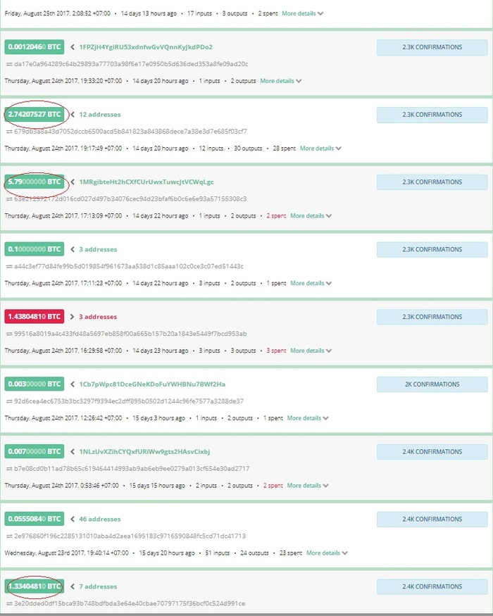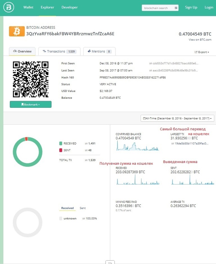 Дата открытие кошелька 8 декабря 2016. На сегодняшнее число Алексею перевели 203 BTC, и он вывел 202 BTC (на 08.09.2017 курс 1BTC ~ 4590$). Конечно, многие переводы были сделаны, когда курс был ниже, но и там суммы огромные.
