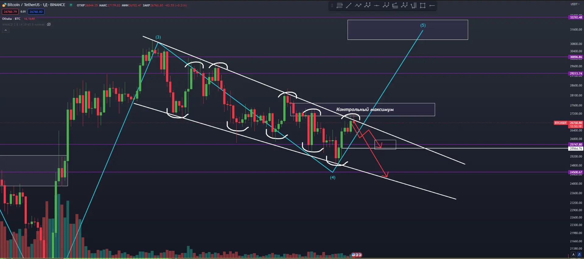 В прошлой статье я писал об ожиданиях по BTC, а именно "мы вполне можем увидеть движение вверх к цене 26500 - 27000$". Так и произошло.