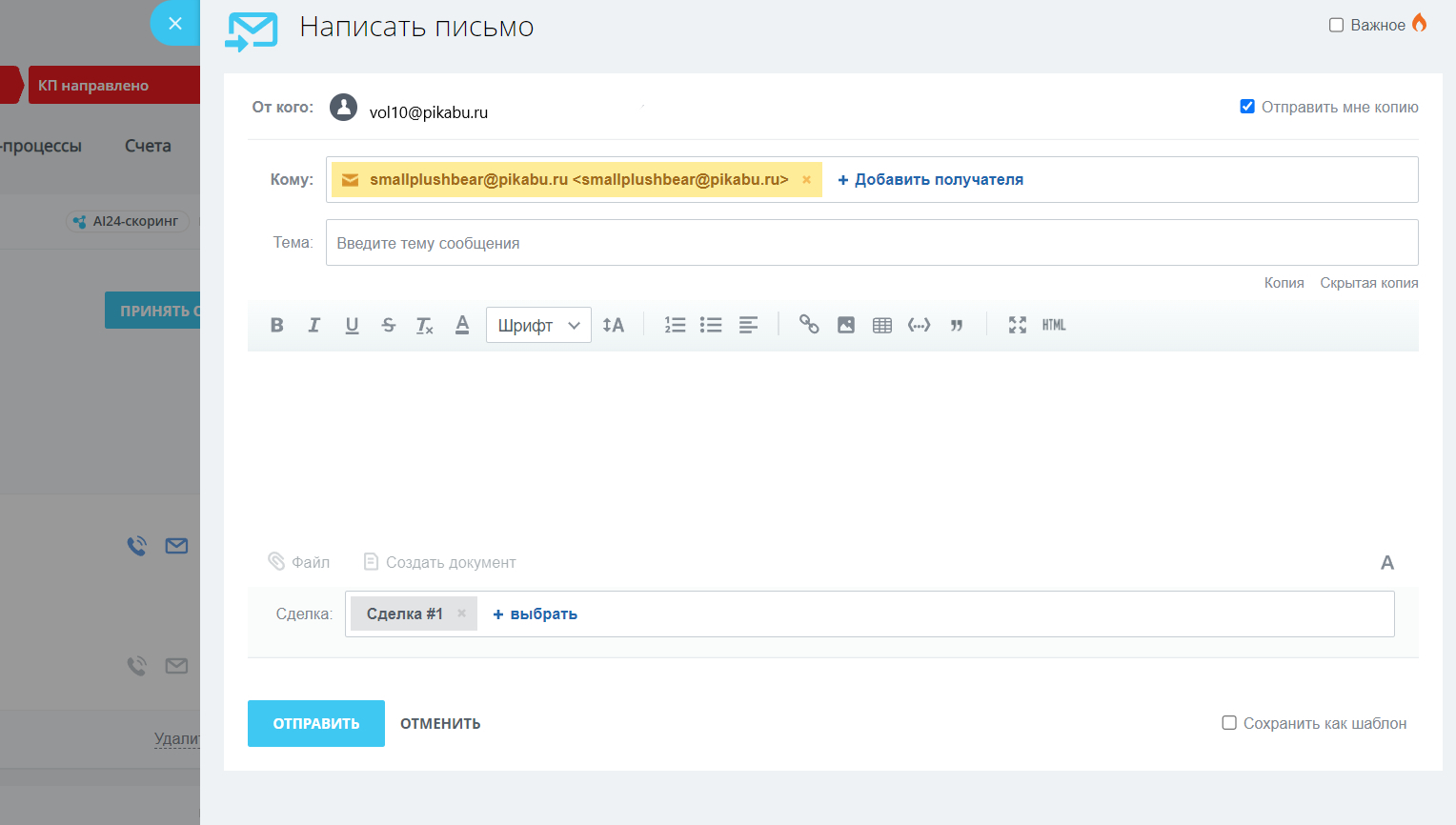 одно единственное письмо из карточки сделки отправлено. Копия пришла мне в ящик.